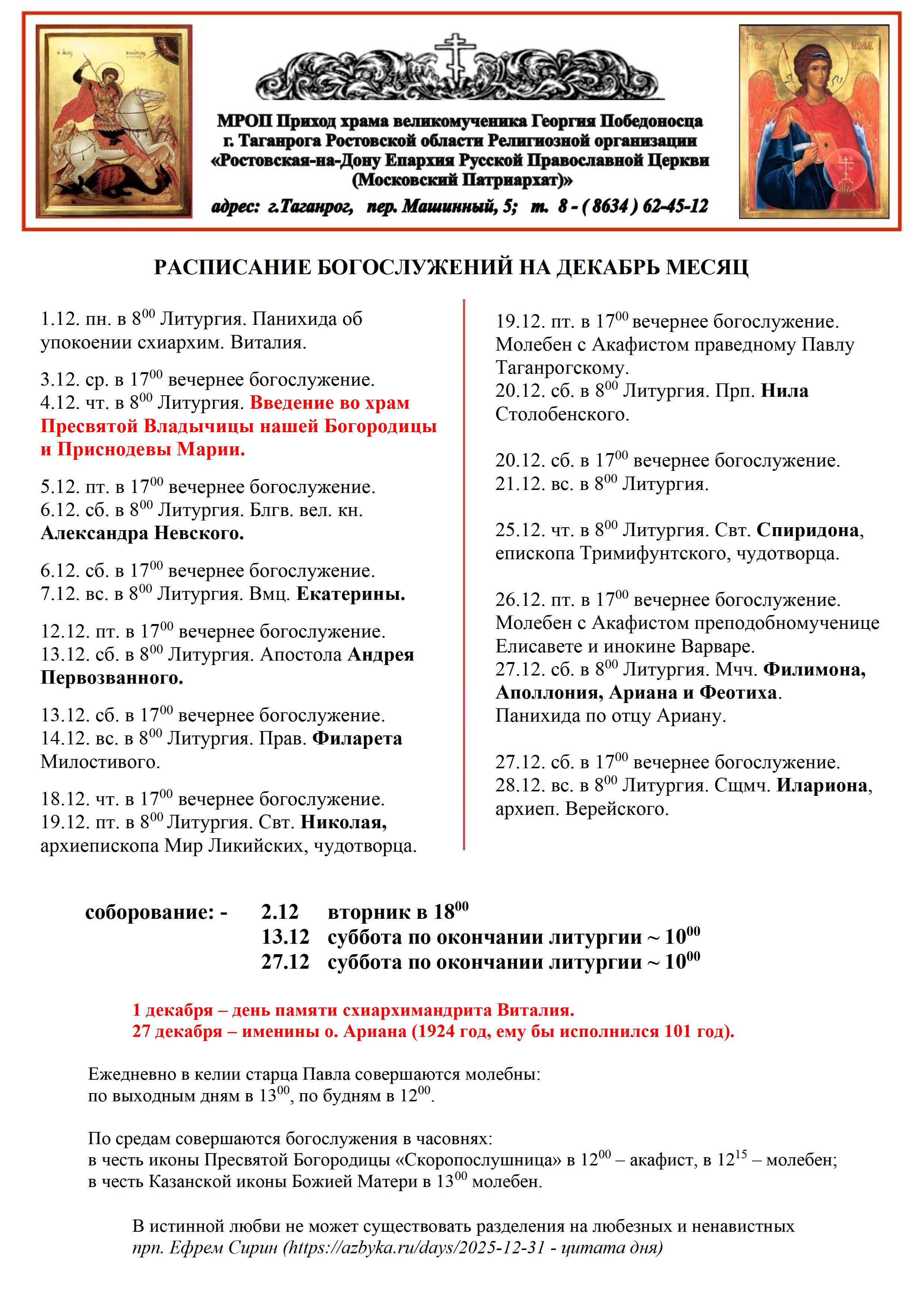 19.12. пт. в 1700 вечернее богослужение. Молебен с Акафистом праведному Павлу Таганрогскому.